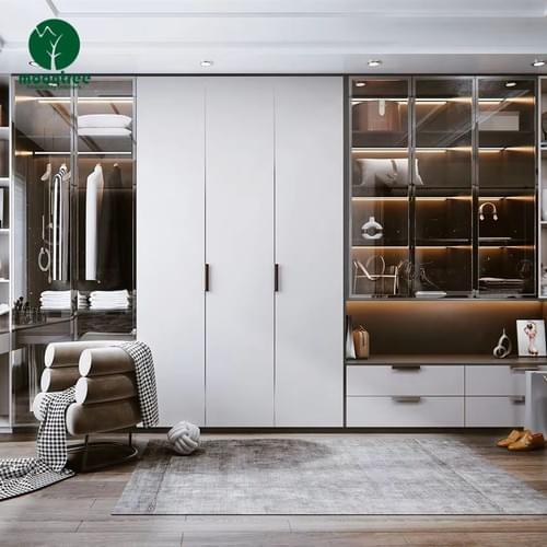 This modern minimalist fixed wardrobe by Moontree is designed for high-end hotel suites and luxury villa bedrooms, blending sleek aesthetics with practical hospitality-grade functionality. Featuring a combination of opaque matte white cabinet doors and clear glass display sections, it creates a balanced look that works for both guest-facing suites and private residential spaces. Integrated warm LED strip lighting illuminates the interior, highlighting stored items while adding a cozy, upscale ambiance that elevates the room’s atmosphere. The design includes dedicated hanging zones, stacked drawer units, and open display shelves for accessories, handbags, or folded linens, maximizing every inch of storage space. Crafted with durable, scratch-resistant finishes and soft-close hardware, this wardrobe withstands frequent use in commercial hospitality environments while maintaining a polished, contemporary look. Whether for a boutique hotel suite or a villa’s walk-in closet, this custom solution combines modern design, customizable layouts, and long-lasting performance to meet the unique needs of luxury hospitality and residential projects.