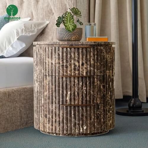 Make a bold statement in your luxury hotel rooms with Moontree’s Fluted Marble Texture Nightstand. This opulent piece features a striking round design covered in intricate vertical fluting that mimics the rich veins of dark Emperador marble, creating a dramatic, textured visual effect. Bronze metal horizontal strips add a refined, antique-luxe touch, enhancing its sophisticated charm. The natural stone-inspired texture brings depth and luxury to any space, making it perfect for high-end resorts and designer hotels. Despite its luxurious appearance, it is constructed with durable commercial-grade materials, ensuring longevity and resistance to wear. The three-drawer structure offers ample storage with smooth, quiet operation. Fully customizable, you can customize the fluting finish, metal accent color, and overall size to match your hotel’s exclusive design. As a leading provider of bespoke hospitality furniture, Moontree delivers unmatched quality and aesthetic appeal, making this fluted nightstand a standout choice for luxury suites, art galleries, and premium hotel projects seeking unique, high-impact design elements.