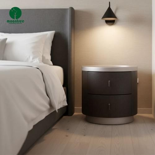 Upgrade your hotel bedroom with our Modern Round Solid Wood Nightstand with Metal Accents — a sleek, space-saving storage solution with contemporary design, perfect for luxury hospitality and villa interiors.