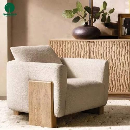 Moontree's modern solid wood accent chair features a durable solid wood frame, soft high-resilience foam cushion, and customizable linen/velvet fabric. This upholstered single sofa chair is perfect for living rooms, hotel lobbies, guest rooms, and hospitality projects, combining comfort, style, and durability. Custom sizes and fabrics available for bulk orders.