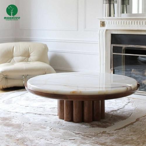 Moontree Round Onyx Coffee Table with Multi-Cylinder Walnut Base